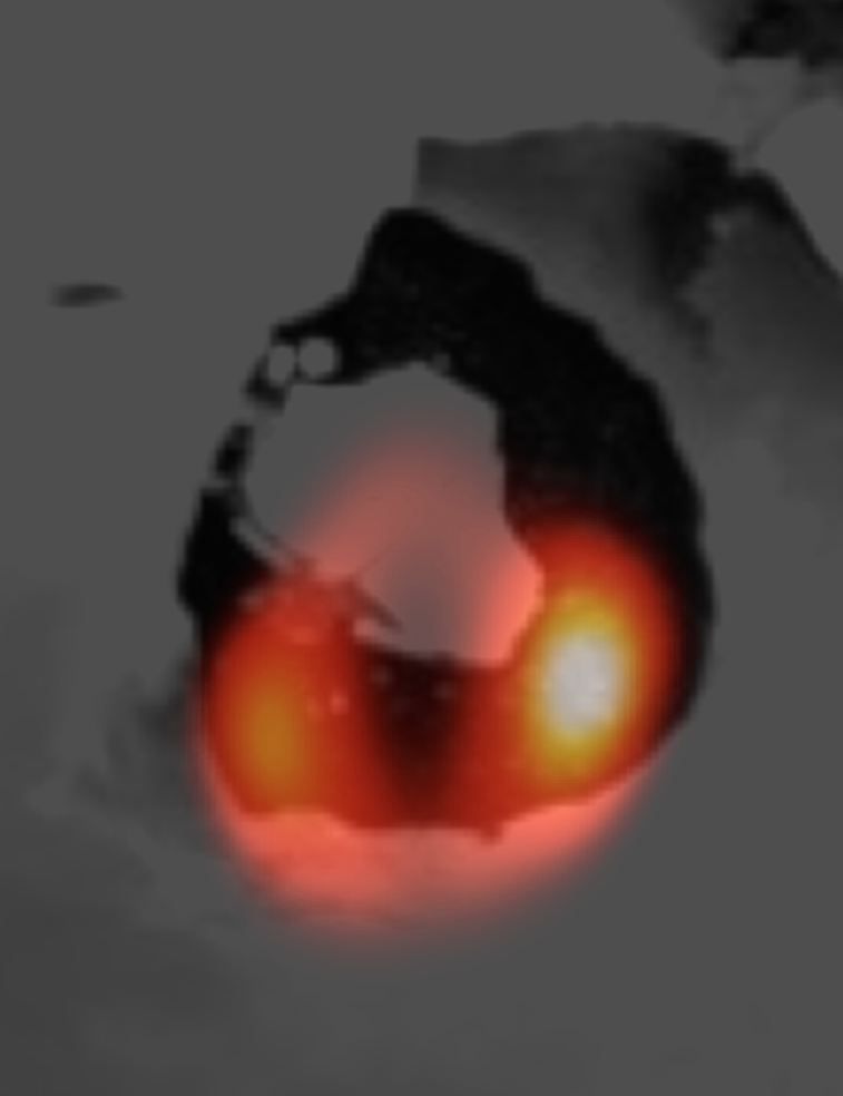 | The LBT image of Loki Patera (orange) laid over a Voyager image of the volcanic depression.The emission (in orange color) appears spread out in the north-south direction due to the telescope point-spread function; it is mainly localized to the southern corners of the lake. Credit: LBTO-NASA |