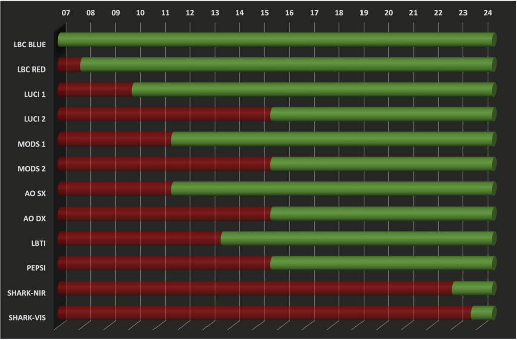 714 papers using LBT observations have been published in refereed journals as of the end of 2024. The evolution of the annual cumulative number of papers per instrument is plotted in the graph on the left. The figure on the right shows the availability of the instruments over time. LBT has been in full binocular mode since 2016.
